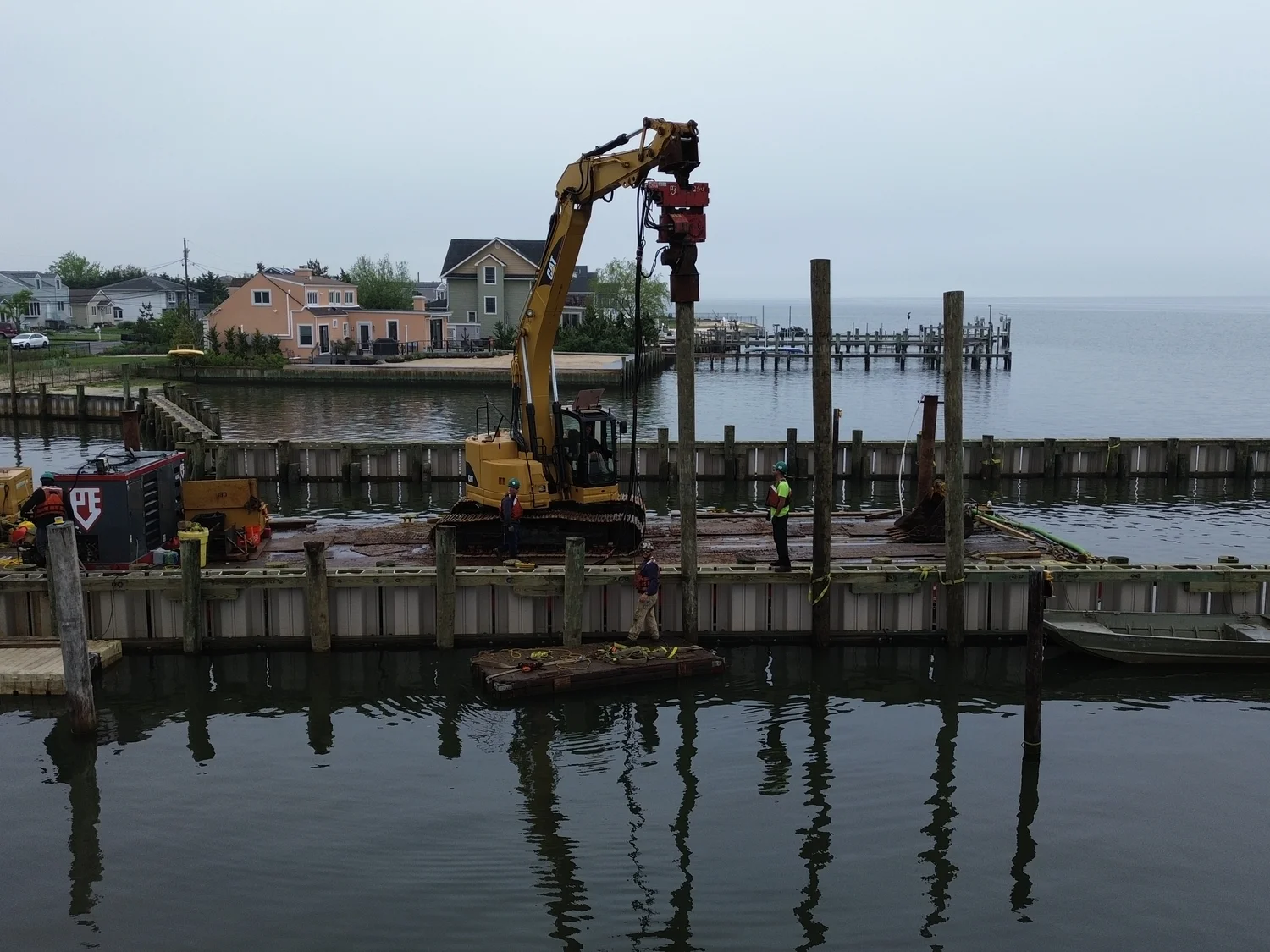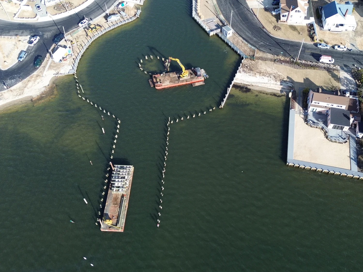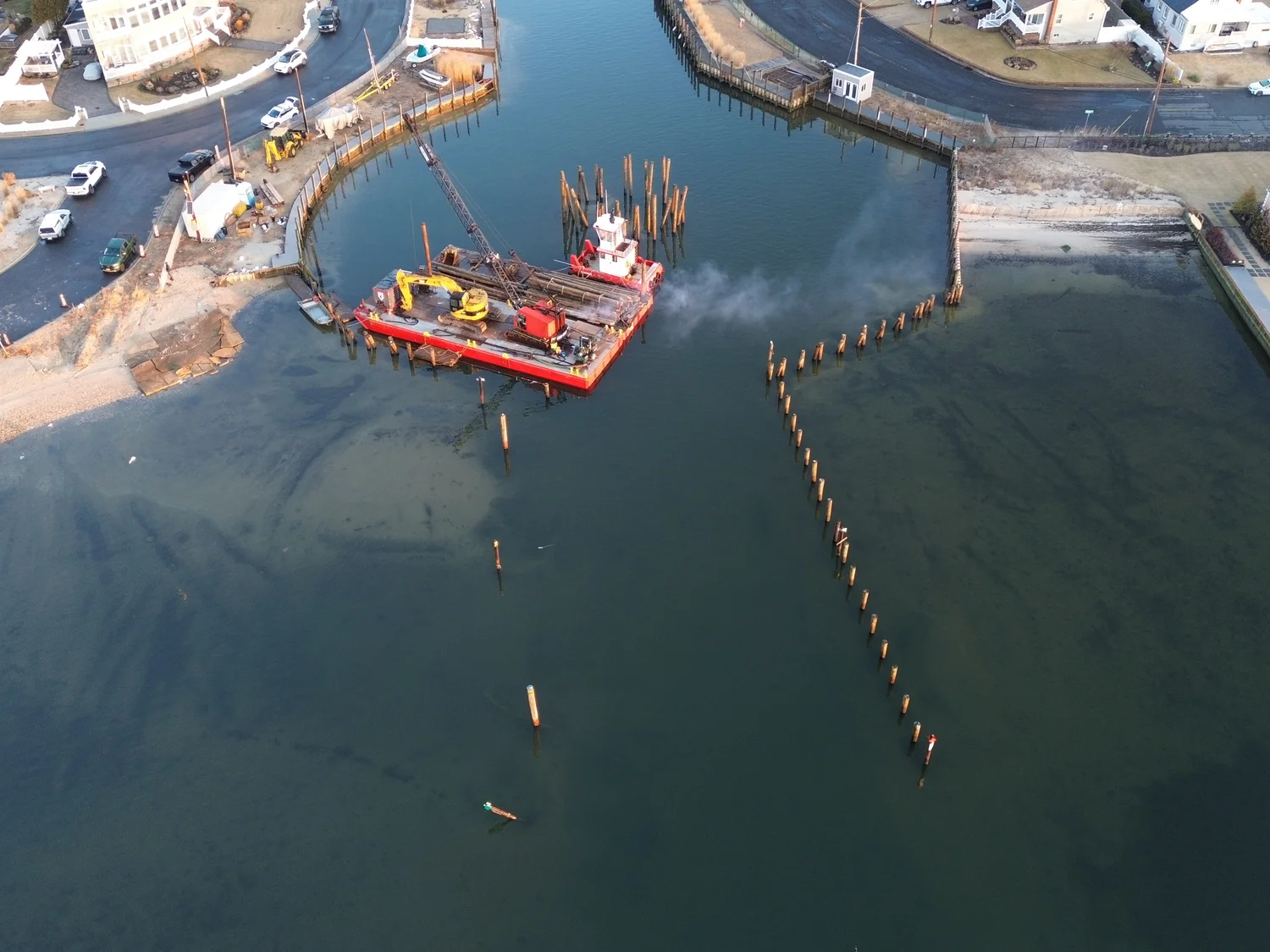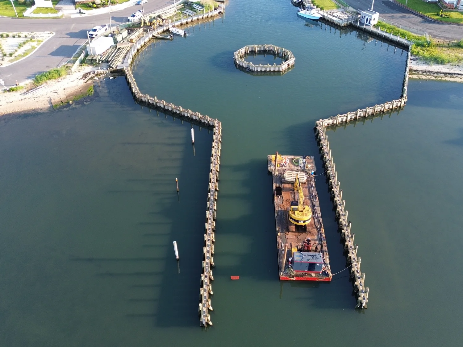 The scope of work included the removal of over 1,000 cubic yards of dredged material to improve navigable depths for local boaters and emergency access. A new sheet pile and heavy timber breakwater system was installed to replace the deteriorated bulkhead, providing long-term protection from erosion and wave action.