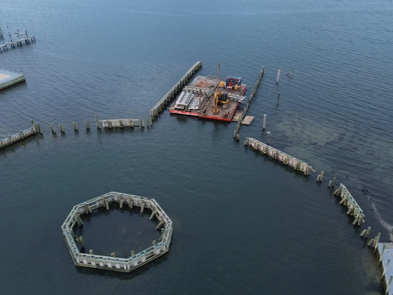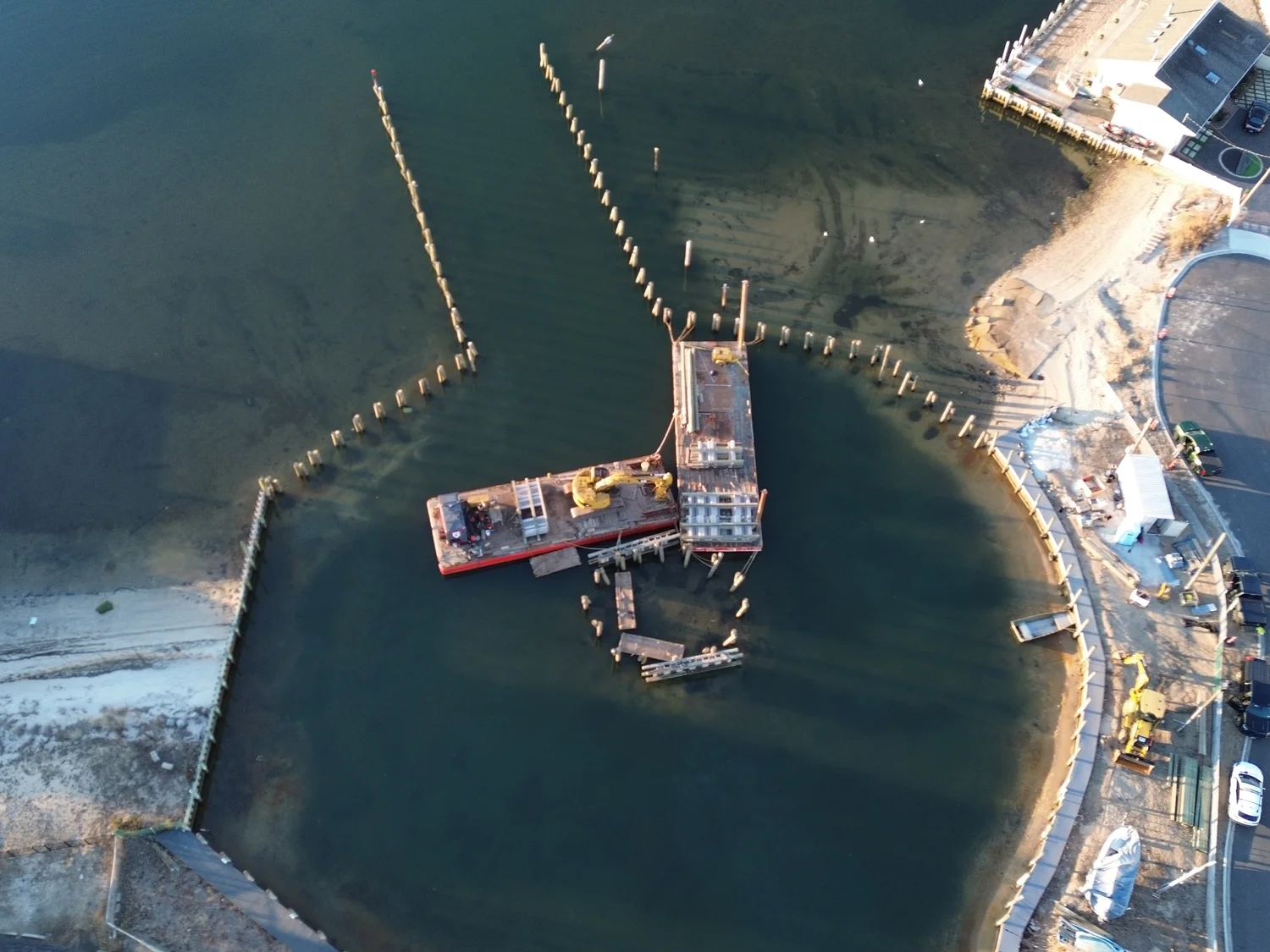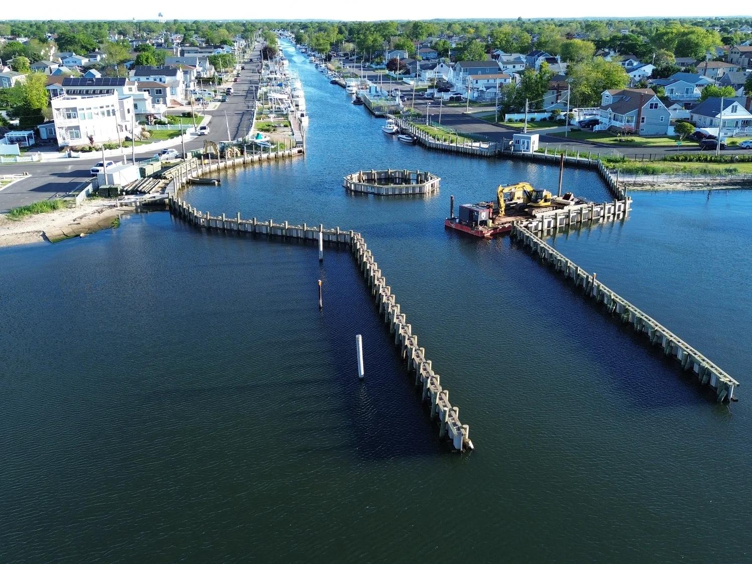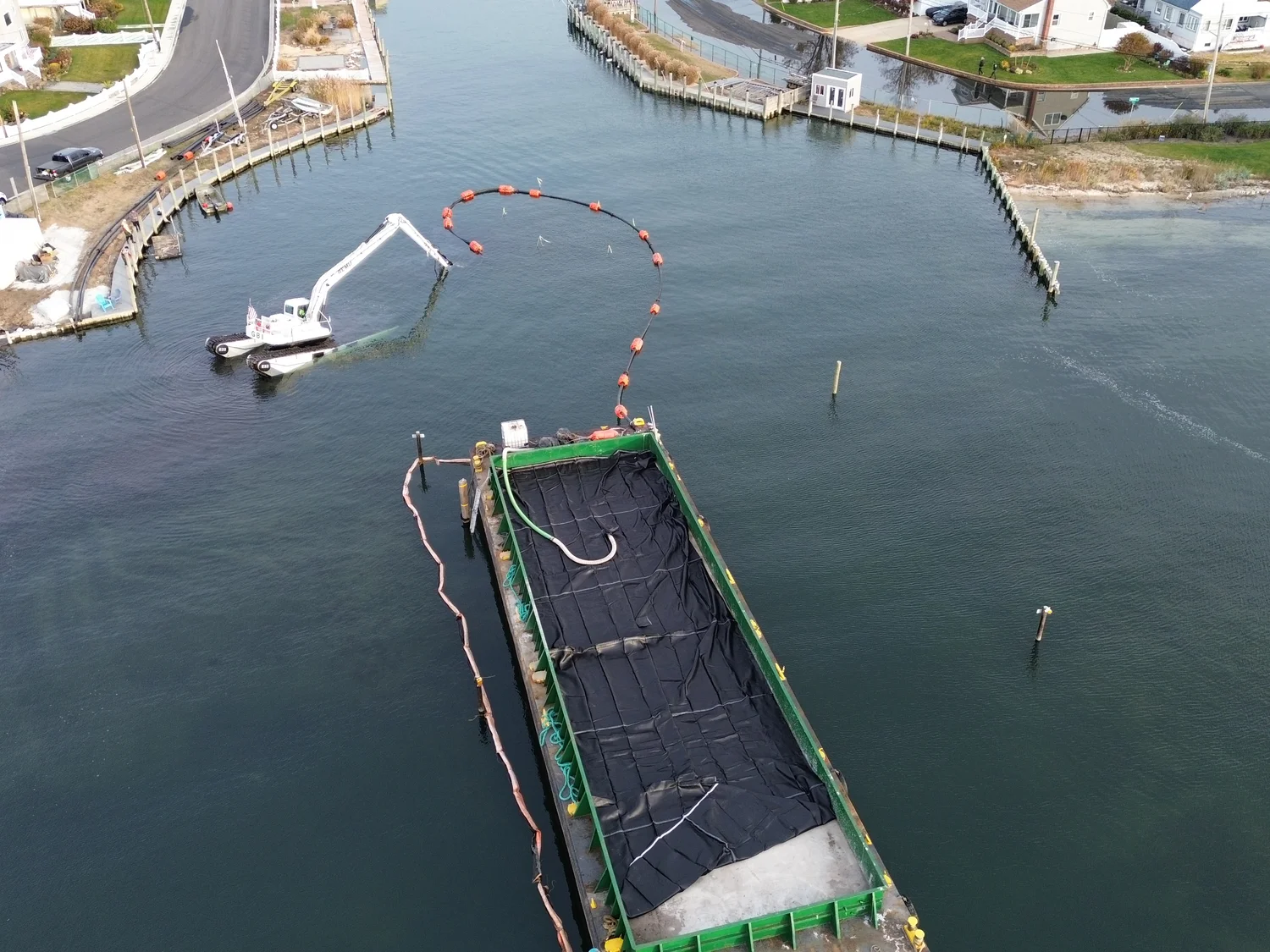 The scope of work included the removal of over 1,000 cubic yards of dredged material to improve navigable depths for local boaters and emergency access. A new sheet pile and heavy timber breakwater system was installed to replace the deteriorated bulkhead, providing long-term protection from erosion and wave action.